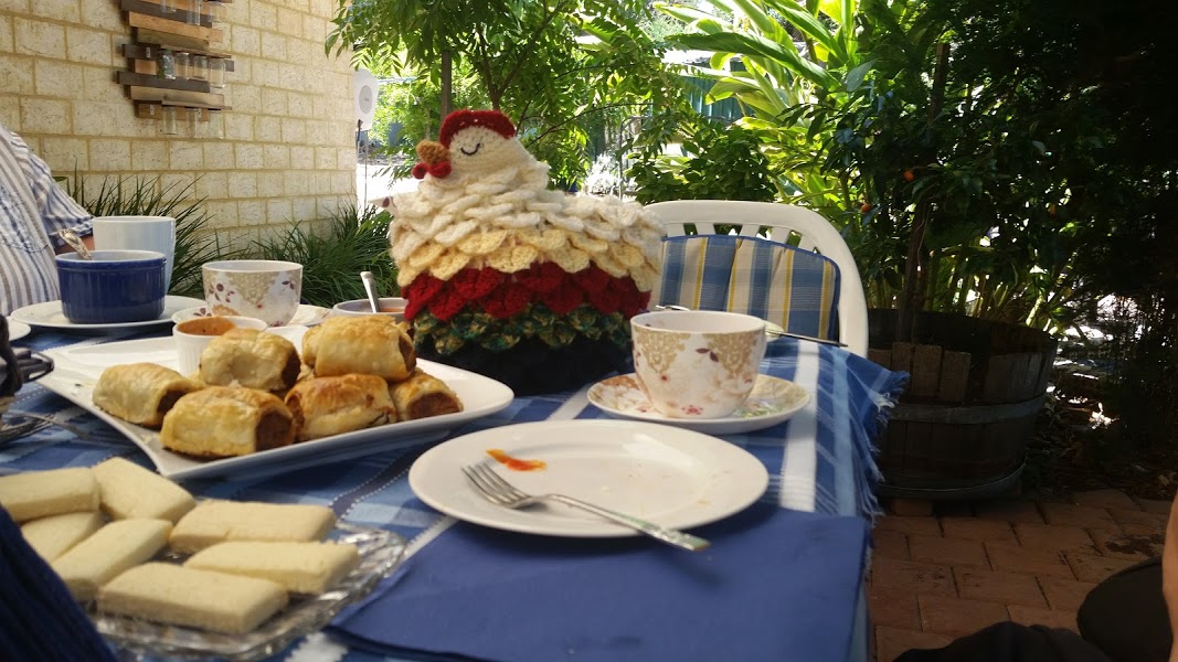 Miss Chick the tea cosy is still holding pride of place on the groaning board at my friend Fifi's place.